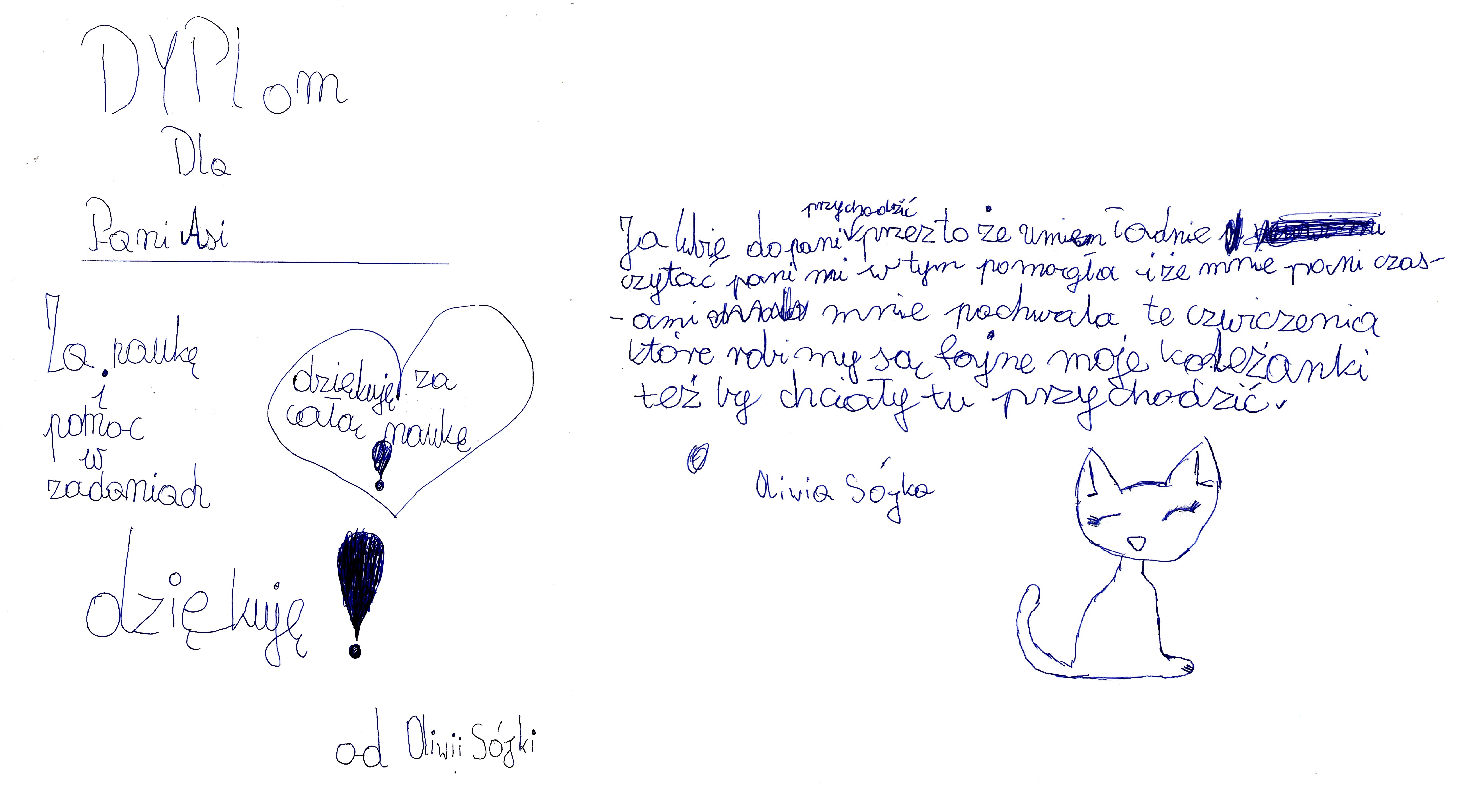 Ma Pani fajny sposób rozmowy. Lubię do Pani przychodzić i czekam na to. Pomogła mi Pani w dużym stopniu np. mniej gadam na lekcji. Doceniam, że Pani mnie we wszystkim rozumie i według mnie niczego nie potrzebuje Pani ulepszać. Najlepsze jest w Pani ZROZUMIENIE. Po prostu lubię tu przychodzić.