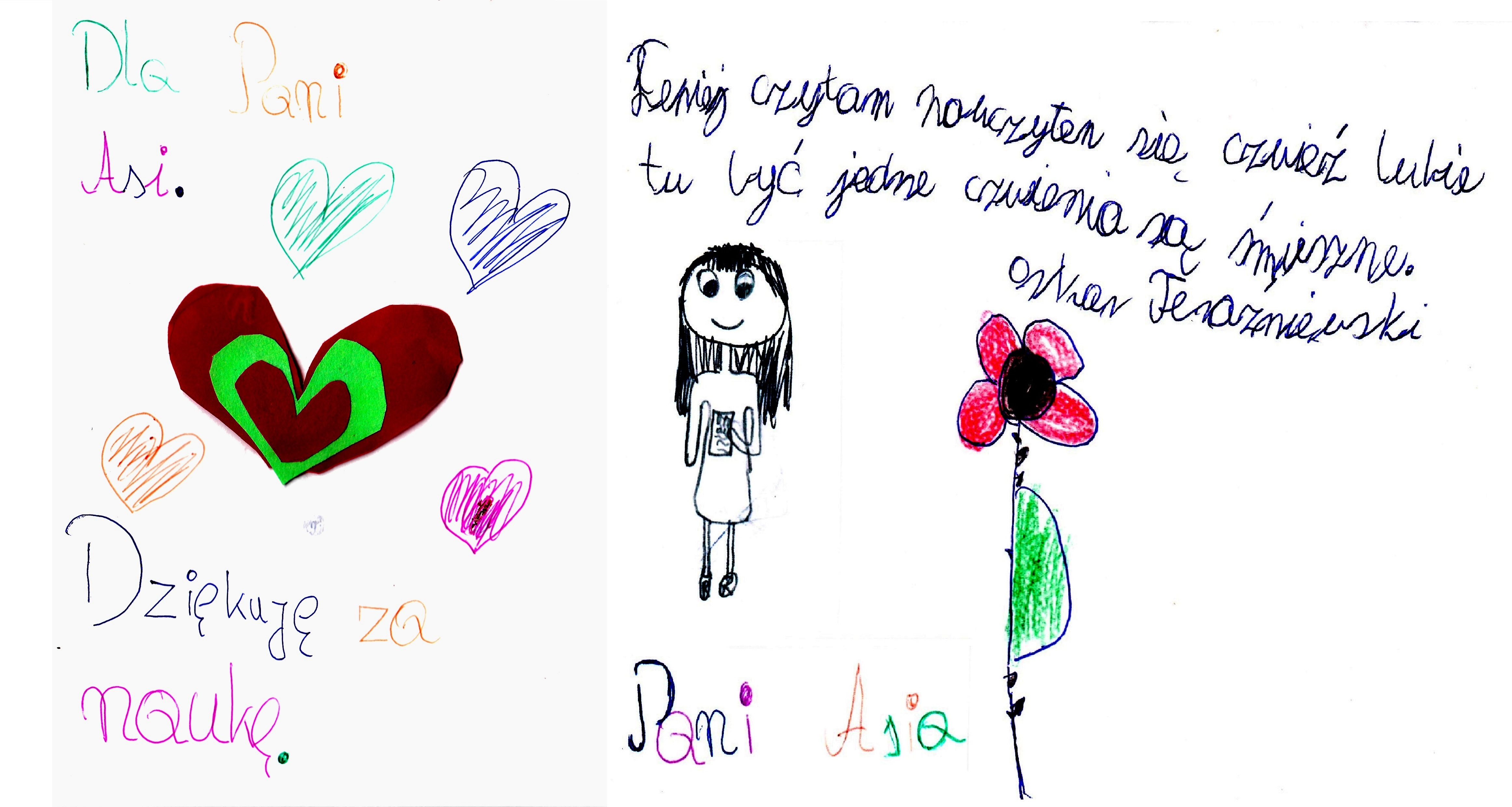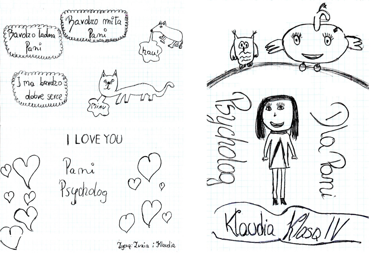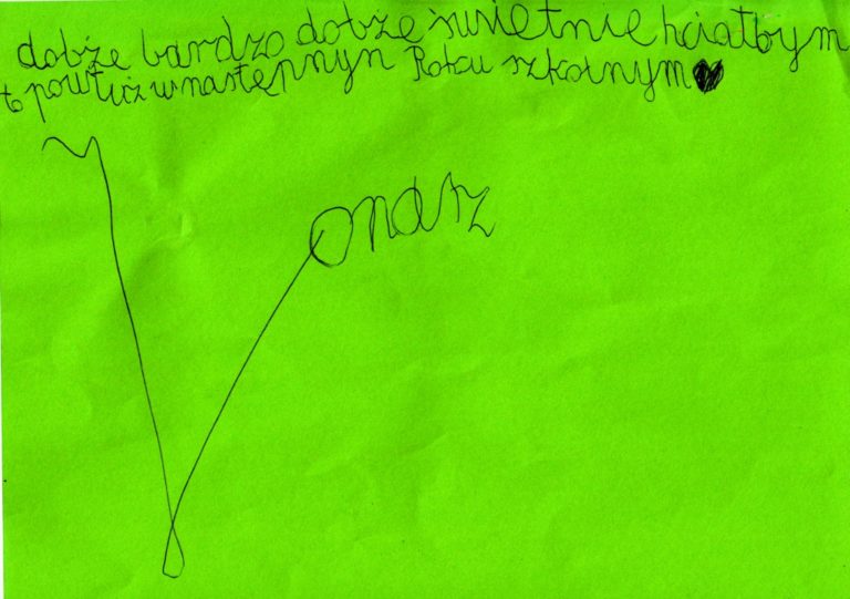 Podczas spotkań z Panią jest luźna atmosfera dzięki czemu można normalnie porozmawiać. Pomogła mi Pani w poprawie kontaktów z koleżanką i rozwiązaniu własnych konfliktów. Najbardziej podoba mi się to, że jest Pani otwarta, miła i bardzo sympatyczna. Jak dla mnie nie ma Pani co poprawiać czy zmieniać. Bardzo dużo nam już Pani pomogła. I nie chodzi o to, że tylko mi, ale i całej szkole. Jesteśmy Pani za to wdzięczni i dziękujemy, że zawsze ma Pani dla nas czas. Wszyscy Pani dziękujemy za pomoc.